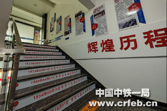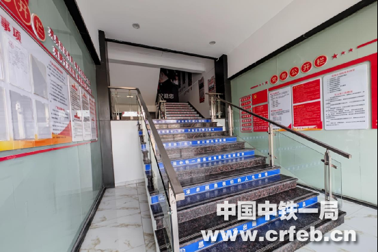 一樓,左側墻面廠務公開欄,將項目部的有關工作公布于眾,讓每一名員工有知情權,能調(diào)動員工參與管理的積極性;右側的墻面黨務公開欄里,有“黨員權利”“黨員義務”以及“黨支部工作職責”等內(nèi)容,既讓黨員們時時牢記自己的使命,又能起到請群眾監(jiān)督黨員的作用。在樓梯的下部臺階立面除了企業(yè)核心價值觀等等,還張貼了“既然選擇了遠方,便只顧風雨兼程”“與其羨慕他人優(yōu)秀,不如自己努力奮斗”等等勵志標語;上半部右側墻面,是黨的“輝煌歷程”知識,臺階立面張貼著黨的幾次代表大會召開的時間和地點等黨建歷史文化。在樓梯間的墻壁上,一幅習近平總書記接見中鐵一局電力工高級技師竇鐵成的大型照片映入眼簾,使員工們倍感親切、深受鼓舞、信心滿滿,員工的榮譽感、自豪感油然而生。