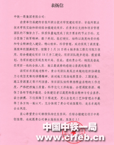 近日,甘孜州海螺溝投資發展集團有限公司發來表揚信,對中鐵一局建安公司承建的甘孜州職業技術學院建設項目高質量交付給予高度贊譽,對甘孜州職業技術學院實驗和培訓綜合樓項目的高效推進表示充分認可。