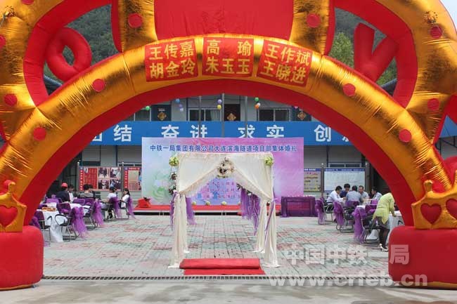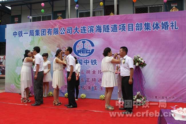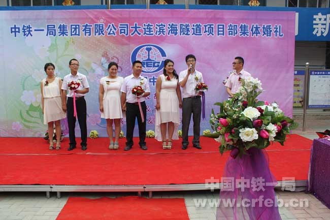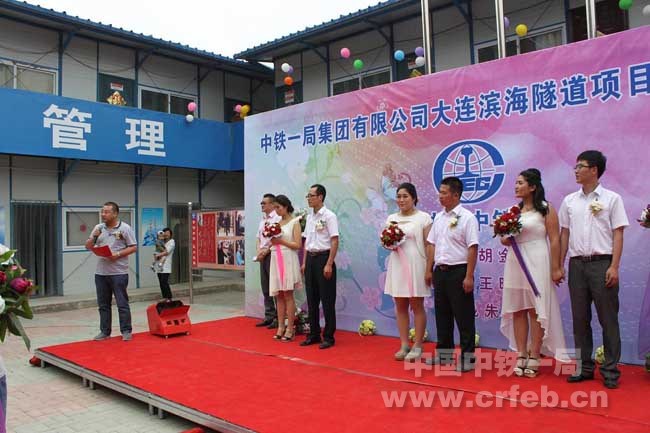 6月1日,大連濱海隧道二標(biāo)項(xiàng)目部為三對(duì)奮戰(zhàn)在施工一線的新人們舉辦了集體婚禮。