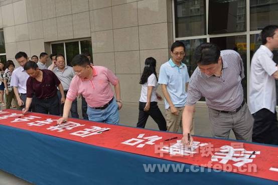 5月30日上午,中南鐵路通道項目經理部在山西長治舉行2014年安全生產月啟動儀式。圖為項目員工在橫幅上簽名