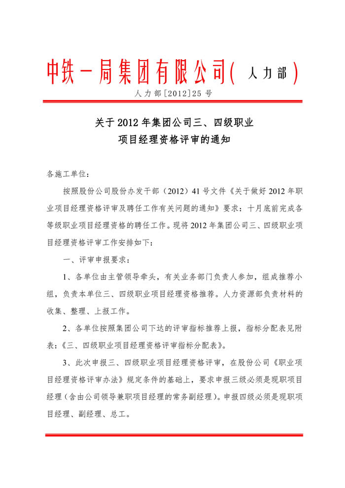 關(guān)于2012年集團(tuán)公司三、四級職業(yè)項(xiàng)目經(jīng)理資格評審的通知