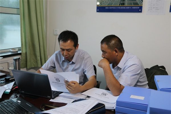 考核組首先對在洪水中遭受侵襲的項目部員工進行了慰問。在首次會議上,考核組認真聽取了項目黨工委書記李文順對工程概況、工程進度、項目黨建工作等方面的匯報,并對考核組人員檢查分工進行了明確。隨后,檢查組按照分工對各部室上半年的工作情況及內頁資料進行了全面仔細的檢查。