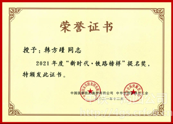“新時代·鐵路榜樣提名”榮譽證書
