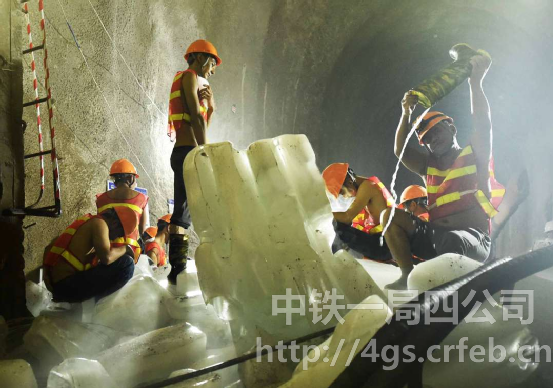 隧道的高地熱使施工環境達到41攝氏度,工人們在冰塊上休息,輪換作業。