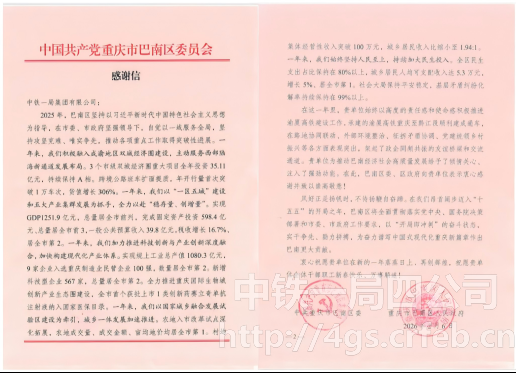 2025年,公司秉持強烈責任感和使命感,充分發揮專業優勢,全力推進重黔鐵路建設,在與巴南區委、區政府的協作中,雙方圍繞路地聯動、環境整治、征拆協調等重點任務緊密配合,同頻共振。此次獲贈感謝信,正是對中鐵一局擔當作為與工作實效的充分肯定。