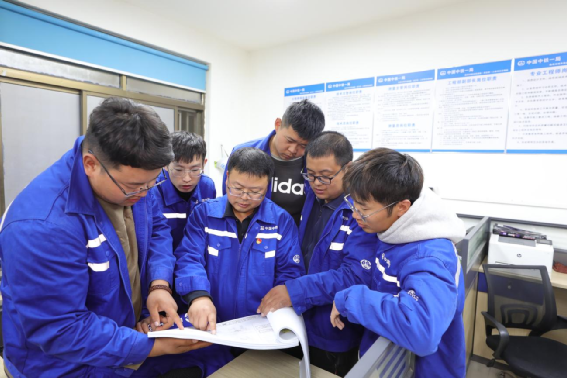 張亞會(左三)與項目工程部技術員共同討論施工難題——王利攝