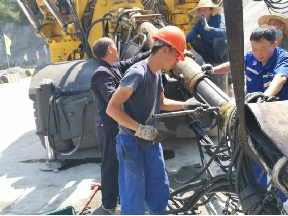 綿綿細雨裹挾著山野的泥土氣息,滴落在維修服務中心的鐵皮棚頂,發出細密的滴答聲,與棚內扳手與螺栓相撞的脆響,成為工具與自然的即興合奏。拜旭哲蹲在一臺滿是油污的三臂鑿巖臺車旁,他的工裝早已被油污浸透,后背洇出層層鹽霜,卻仍像臺精密儀器般專注——此刻他正俯身檢查臺車液壓系統的滲漏點,指尖在油管與閥門間游走,仿佛在撫摸一件沉睡的巨獸。