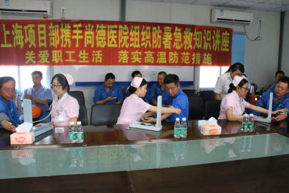 上海訊:通訊員 樊靜 李瓊會  近期上海持續高溫,最高溫度達40℃。天氣酷熱難耐,施工現場一線參建員工的安全作業是項目部關注的重點。為落實高溫防范措施,抓好員工生產生活保障,關愛員工身心健康,7月29日下午,上海9號線10標項目工會邀請上海尚德醫院醫務科科長、體檢中心主任、急救示范護士共6名醫務人員為項目部員工開展夏季防暑急救知識講座并進行現場體檢。