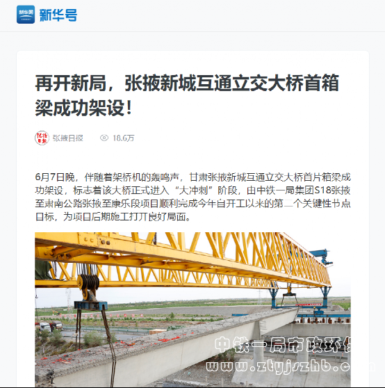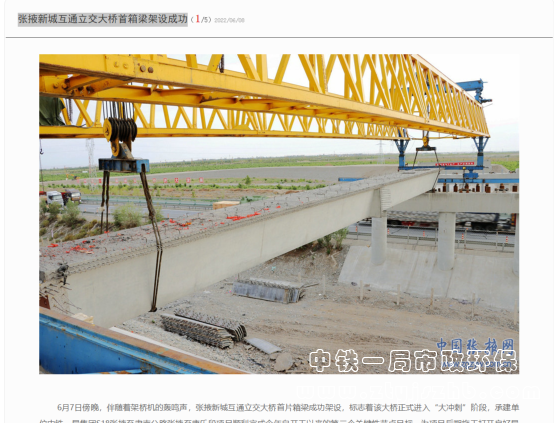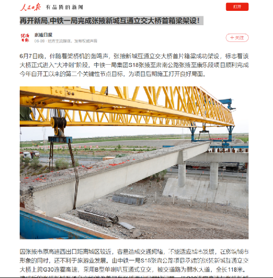6月9日,人民日報報道:再開新局,中鐵一局完成張掖新城互通立交大橋首箱梁架設!