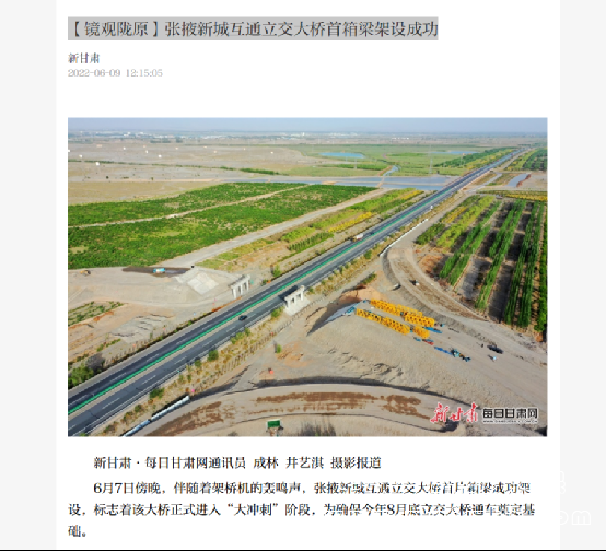 多家媒體報道公司承建的張掖新城互通立交大橋首箱梁架設成功。