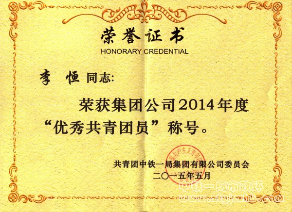 李恒榮獲集團公司2014年度“優秀共青團干部”稱號