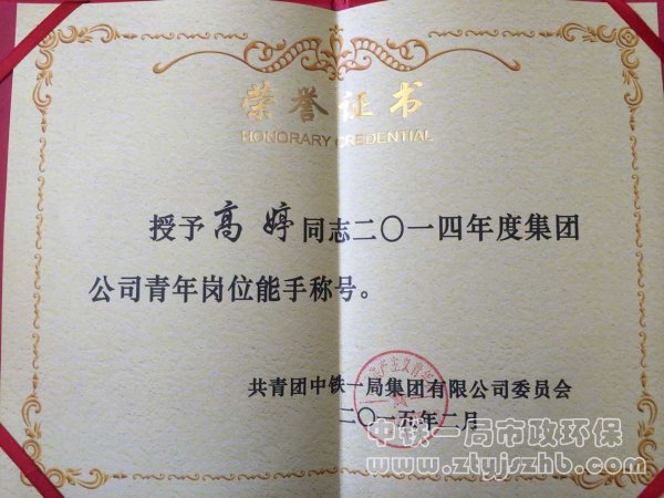 高婷榮獲2014年度集團公司青年崗位能手稱號