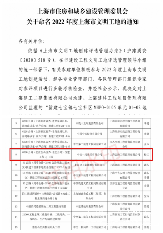 近日,在上海市住建部、交通委、工程質量監(jiān)督站等多部門聯(lián)合組織的評比中,由公司承建的G320改建公路SJ-1標項目在上海市工程項目文明工地的評選中榮獲“2022年度上海市文明工地”榮譽稱號。