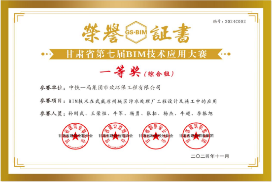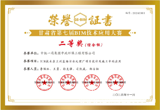 BIM技術在武威涼州城區污水處理廠工程設計及施工中的應用成果榮獲中國市政工程協會舉辦的2024年第六屆“市政杯”BIM應用技能大賽二類成果2024年甘肅省第七屆BIM技術應用大賽一等獎BIM技術在蕭山錢江超大型地埋式污水處理廠設計及施工中的應用成果榮獲第五屆工程建設行業BIM大賽成果BIM技術在蘭州鹽場污水處理廠項目設計及施工中的應用成果榮獲2024年甘肅省第七屆BIM技術應用大賽二等獎