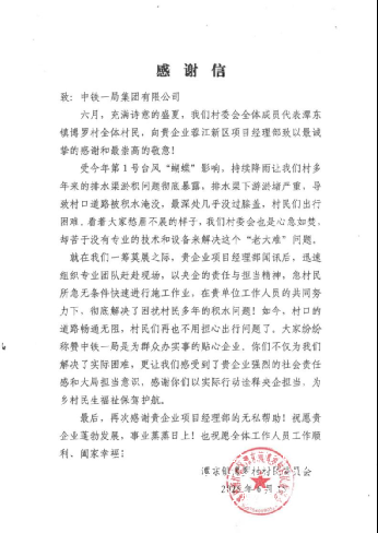 近日,中鐵一局接連收到兩份特殊的“禮物”:蓉江新區項目部收到潭東鎮博羅村委會送來的錦旗與感謝信,大上崇項目獲社溪鎮麻田村委會贈予的錦旗。這兩面錦旗與感謝信,既是村民對項目團隊工作的肯定,更是對公司踐行社會責任、心系群眾需求的高度認可。
