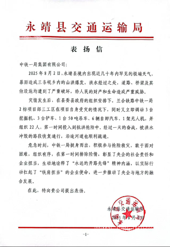 8月4日,中鐵一局集團(tuán)蘭合鐵路項(xiàng)目三工區(qū)收到永靖縣交通運(yùn)輸局表揚(yáng)信,對(duì)項(xiàng)目在極端災(zāi)情面前挺身而出、主動(dòng)擔(dān)當(dāng)?shù)蔫F軍精神給予高度肯定,稱贊項(xiàng)目以實(shí)際行動(dòng)深化了企地融合發(fā)展,為地方搶險(xiǎn)救災(zāi)工作作出重要貢獻(xiàn)。