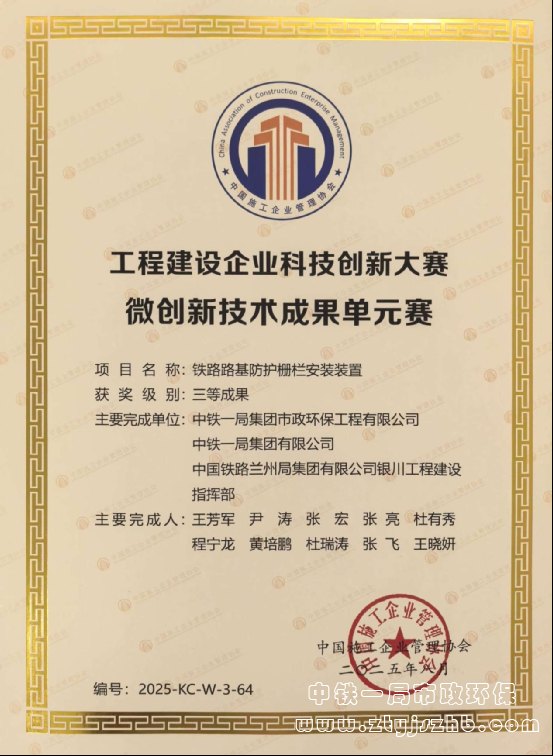 近日,從中國施工企業(yè)管理協(xié)會傳來喜訊,市政環(huán)保公司銀巴鐵路項(xiàng)目申報的《鐵路路基防護(hù)柵欄安裝裝置》成果,榮獲工程建設(shè)企業(yè)科技創(chuàng)新大賽微創(chuàng)新技術(shù)成果單元賽“三等成果”。該成果曾獲批國家知識產(chǎn)權(quán)局頒發(fā)的國家實(shí)用新型專利。