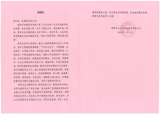 表揚信指出,項目始終堅守大局意識,堅決服從叢臺區(qū)教體局、叢臺區(qū)建投公司的管理部署和各項工作要求,嚴格恪守工程建設各項規(guī)章制度,分別嚴守生態(tài)保護、安全生產(chǎn)、工程質(zhì)量、文明施工底線,規(guī)范施工流程、強化過程管控,執(zhí)行力強、作風嚴謹,以高標準、嚴要求推進項目建設,確保各項工作合規(guī)有序、落地見效,充分展現(xiàn)了過硬的執(zhí)行力和責任意識。此次通報表揚既是對中鐵一局過往工作的充分肯定,更是對后續(xù)工作的有力鞭策。項目的順利推進,離不開項目人員辛勤付出和堅守奉獻,項目的突出表現(xiàn),為叢臺區(qū)后續(xù)重點工程建設樹立了標桿、積累了寶貴經(jīng)驗。