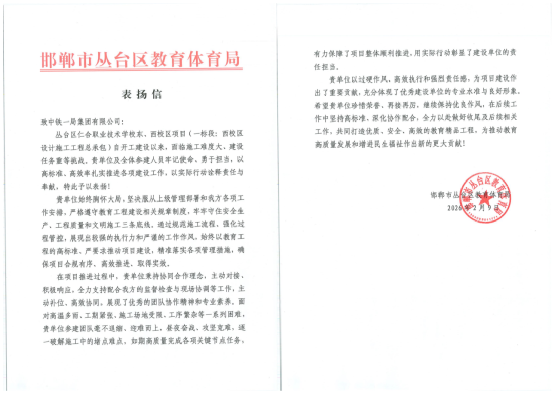 滏陽河流域防洪治理工程、叢臺仁合職業(yè)學校項目獲多封表揚信