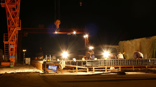 面對重重困難,梁場員工們在項目經理趙斐,書記李力,副經理丁建峰,總工曹新剛帶領下,發揚“亮劍”精神,瞄準高端技術瓶頸,成立了QC技術攻關小組,由項目總工曹新剛掛帥,有關技術骨干日夜攻關,他們依據以往的生產經驗,查閱了大量的國外有關技術資料,通過小規模的試驗,取得了關鍵環節上的技術突破。相繼攻克了一次連續灌注328立方高性能混凝土技術;整體內外模板施工技術;大噸位鋼筋的綁扎、安裝、吊裝技術;900噸箱梁4支點不平整度小于2毫米的移運技術;高性能耐久混凝土的施工控制技術等五項技術難題。項目部制定了詳細的工藝細則、工法規范和制度規定,并進行認真研討論證,各項準備工作項目經理趙斐、副經理丁建峰、總工曹新剛都要親自參加。拌合站運轉,混凝土泵輸設備,內外模就位,鋼筋裝吊,試運轉、試拼、試吊、試拌情況等,第一手資料都要親自掌握。對人力配備是否充分,操作過程工具備件是否齊備都充分認真地考慮安排。為了取得混凝土最佳配比,副經理丁建峰同試驗室員工一起熬了幾個通宵直到取得理想結果。為了確保萬無一失,對投產灌注過程可能出現的意外都事先制訂了應急預案。