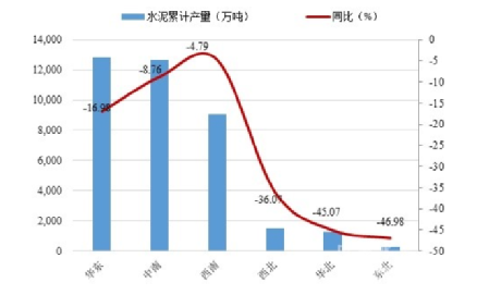 全國(guó)六大區(qū)域中水泥累計(jì)產(chǎn)量均同比下滑,東北、華北和西北地區(qū)水泥產(chǎn)量急劇下滑,其中東北和華北地區(qū)自2017年起增速就持續(xù)下滑,西北地區(qū)自2017年6月份增速轉(zhuǎn)正為負(fù)后一路下滑。西南地區(qū)從2017年下半年開(kāi)始下滑,華東和中南地區(qū)從2017年底開(kāi)始下滑。