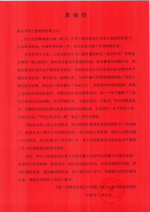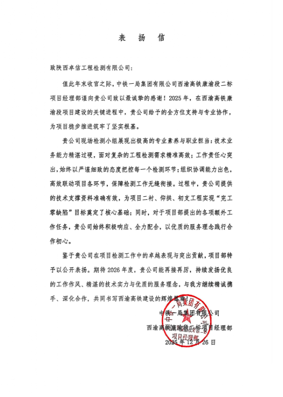 與此同時,在西渝高鐵康渝段二標(biāo)項目建設(shè)中,公司現(xiàn)場檢測小組憑借精湛的技術(shù)能力、高度的責(zé)任心和出色的協(xié)調(diào)能力,為項目實現(xiàn)“完工零缺陷”目標(biāo)提供了核心技術(shù)支持。項目部在表揚(yáng)信中特別提到,公司在項目部提出的各項額外工作任務(wù)時,始終響應(yīng)迅速、全力配合,以優(yōu)質(zhì)的服務(wù)理念踐行合作初心,展現(xiàn)了良好的企業(yè)風(fēng)貌。