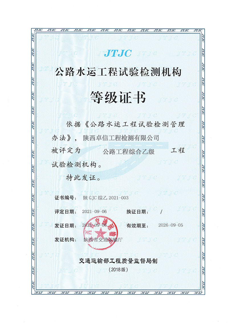 可承擔公路工程:土、集料、巖石、水泥、水泥混凝土及砂漿、水、外加劑、摻和料、無機結合料穩定材料、瀝青及瀝青混合料、鋼材及連接接頭、路基路面、混凝土結構、基坑、地基與基樁、交通安全設施等工程質量檢測業務。